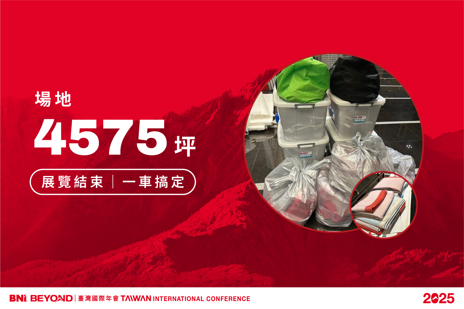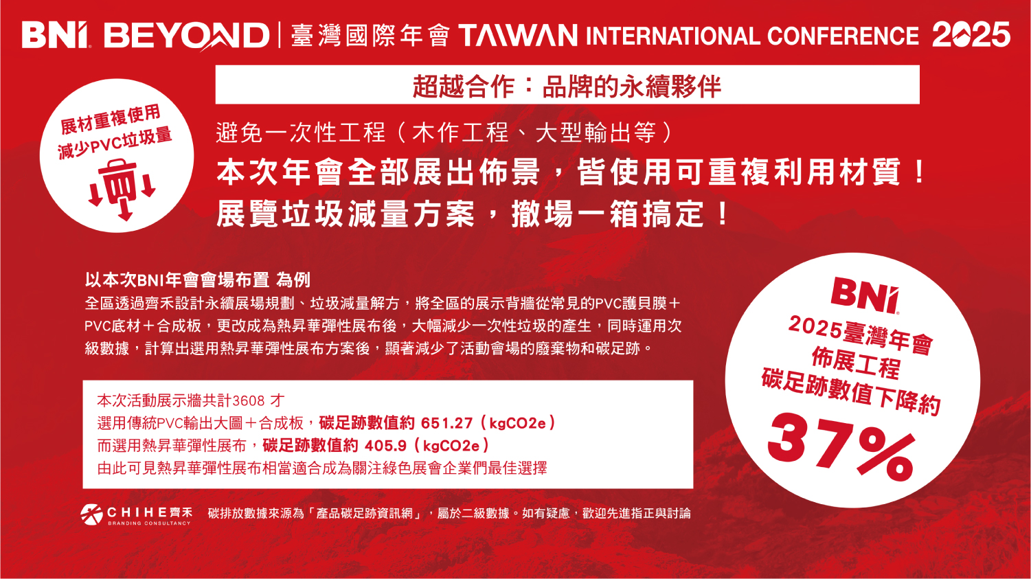 本次BNI台灣國際年會,正式導入 永續展會(Sustainable Event)設計策略,以「超越合作:品牌的永續夥伴」為核心,全面採用可重複利用布幕與材質,避免一次性木作、PVC大面積包裝等高耗能、高廢棄展場工程。目標非常明確:減少展覽廢棄物、降低碳排、節省材料與物流能耗,並以可量化的永續成果為台灣BNI建立國際示範案例。
