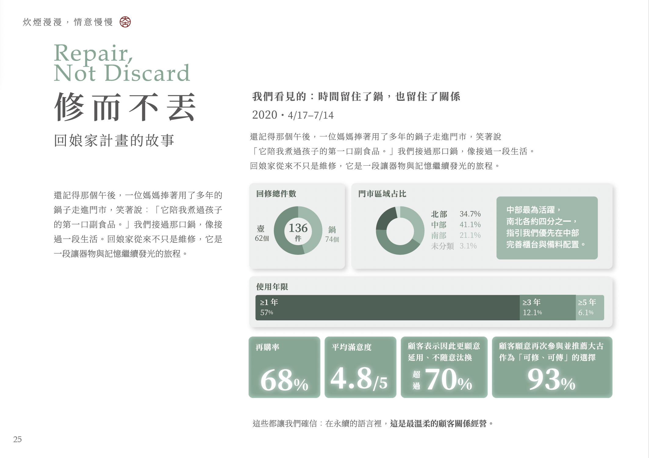 例如在「鑄鐵與永續」、「回娘家維修計畫」、「延壽即減碳」等章節中,透過清楚的圖表與指標對照,大古不只說明理念,更具體呈現每一項行動所帶來的實際影響。